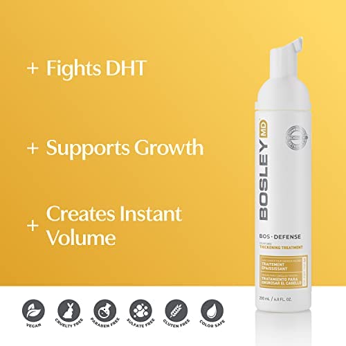 BosDefense Leave-In Thickening Treatment is formulated for those who want to help protect against thinning hair. Designed to help inhibit DHT, this lightweight, foaming, alcohol-free intensive treatment may aid in rejuvenating the scalp and help support the growth of stronger, healthier hair. Pumpkin Seed Extract, a natural DHT-Blocker, plus Apple Stem Cell Extract promote healthy hair growth while Panthenol strengthens and nourishes existing hair. May assist in thickening hair, reconditioning fragile hair and providing instant volume.