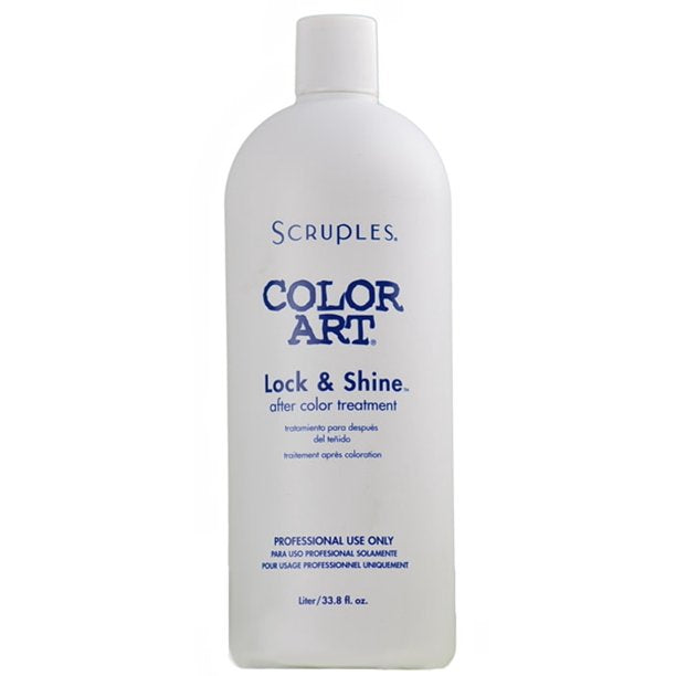 Color Art Lock & Shine seals in the beauty and shine of every Color Art Conditioning Color Gloss service. It helps color last longer by locking in the deposited color pigment, conditioning the hair, and eliminating any chemicals left in the hair following the color service.Following a Color Art Conditioning Color Gloss Service, apply Color Art Lock & Shine to clean, wet hair. Work through the hair thoroughly. Allow to remain on hair 1 to 3 minutes to lock in the color and shine. Rinse, towel dry and proceed with a cut and style Product Options Available are as follows: Size : 33.8 oz - Scruples Color Art Lock & Shine - after color treatment - 33.8 oz;